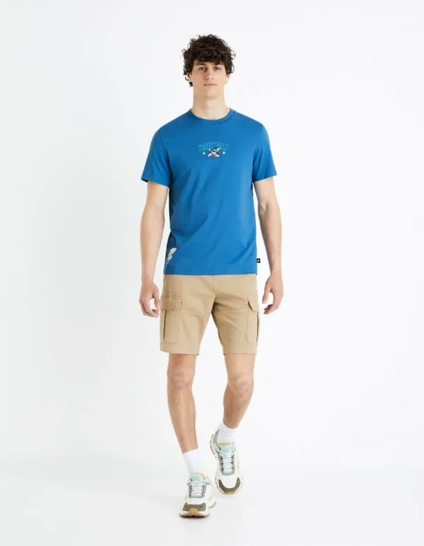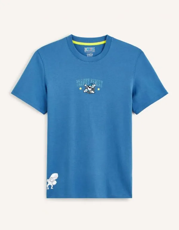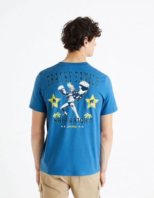 Ce t-shirt bleu à manches courtes rend hommage à l’iconique charpentier du Chapeau de Paille : Franky